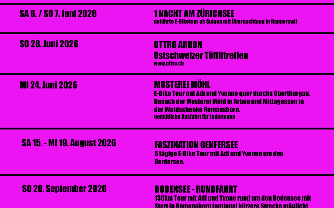 ALLE E-BIKE AUSFLÜGE 2026 ab sofort anmelden! Haben Sie Fragen?Adi Schori steht Dir gerne zur Verfügung.Tel.: 071 642 22 33 Mail an Cycleworld